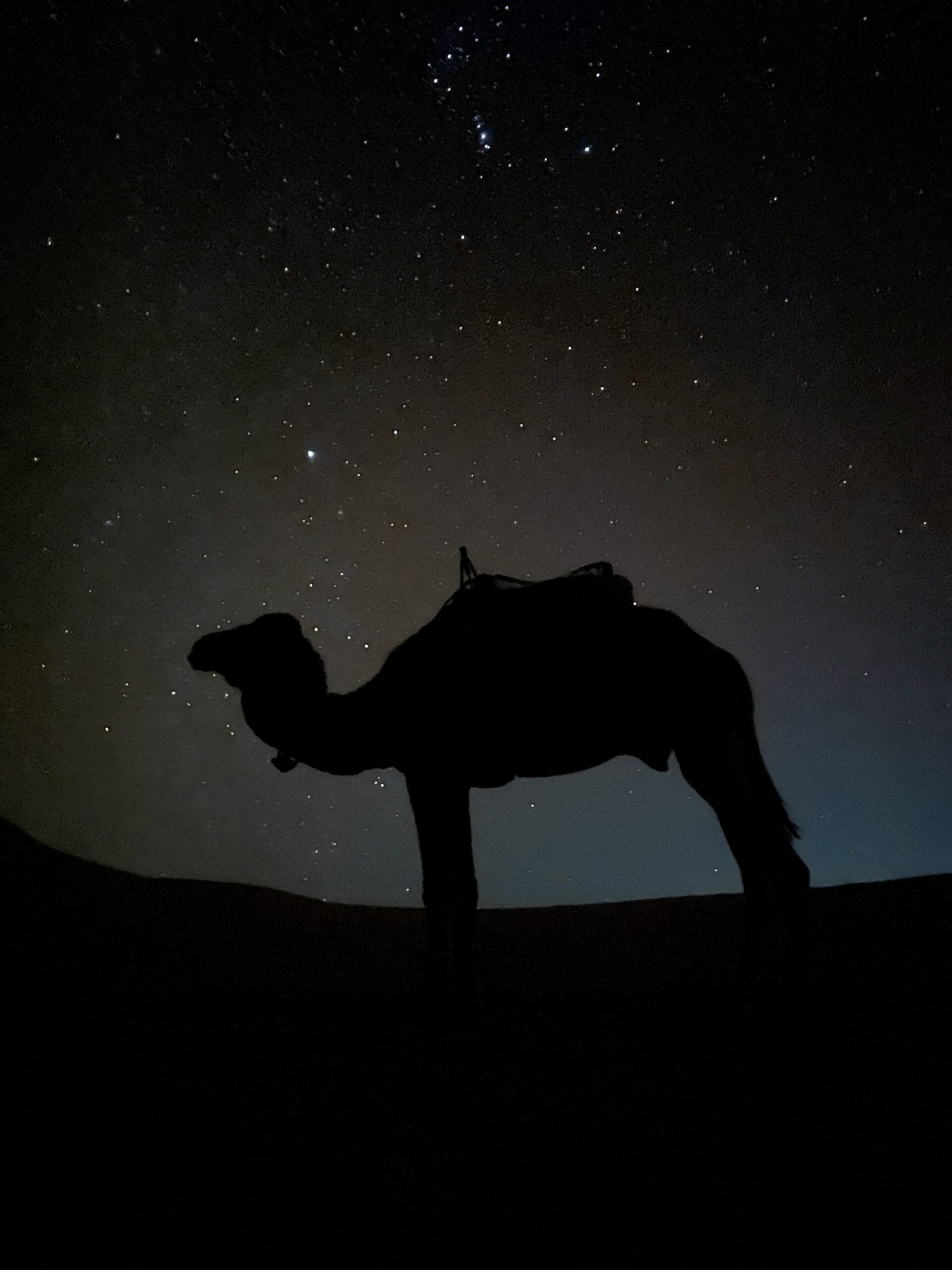 Paseo nocturno en dromedario por el desierto de Merzouga para recorrer las dunas, disfrutar del silencio del Sahara y vivir una experiencia sencilla y agradable bajo las estrellas.