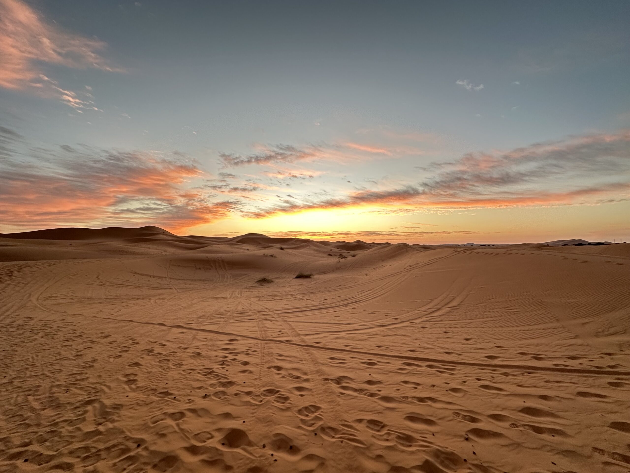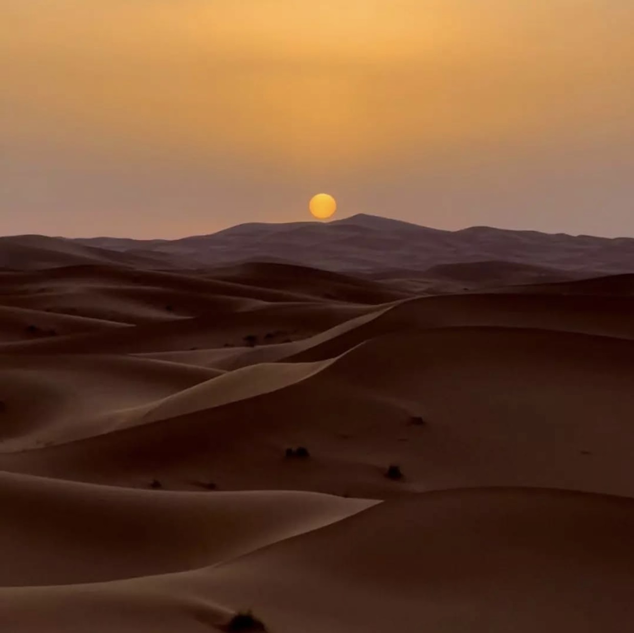 El paseo en dromedario al atardecer en el desierto de Merzouga es una de las formas más especiales de vivir el Sahara. Mientras avanzas por las dunas de Erg Chebbi, verás cómo cambia la luz, cómo se tiñe el paisaje y cómo el desierto se vuelve cada vez más silencioso. Es un momento único del día para disfrutar del entorno, del ritmo del dromedario y de la tranquilidad que ofrece el Sahara cuando cae el sol.