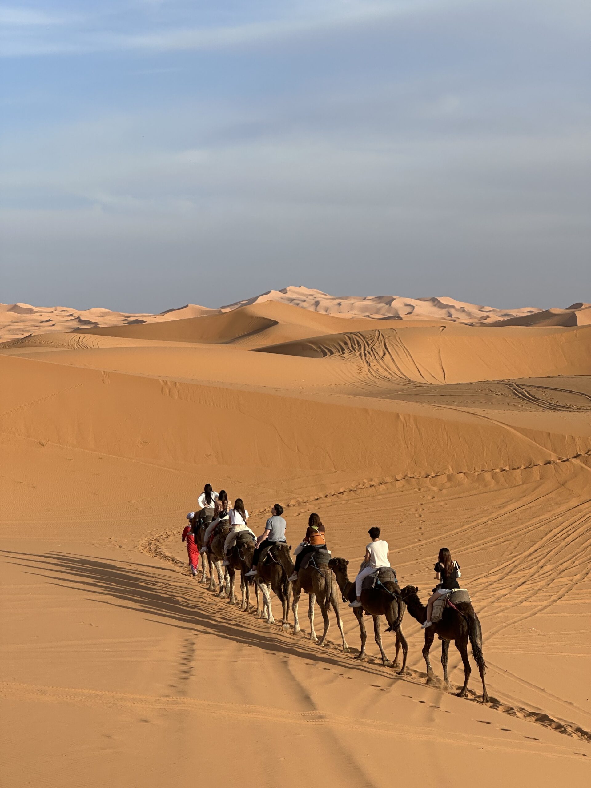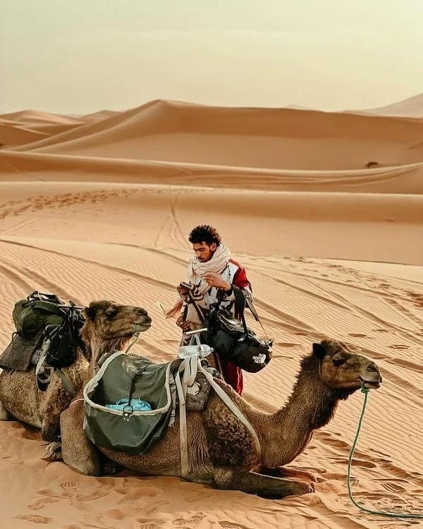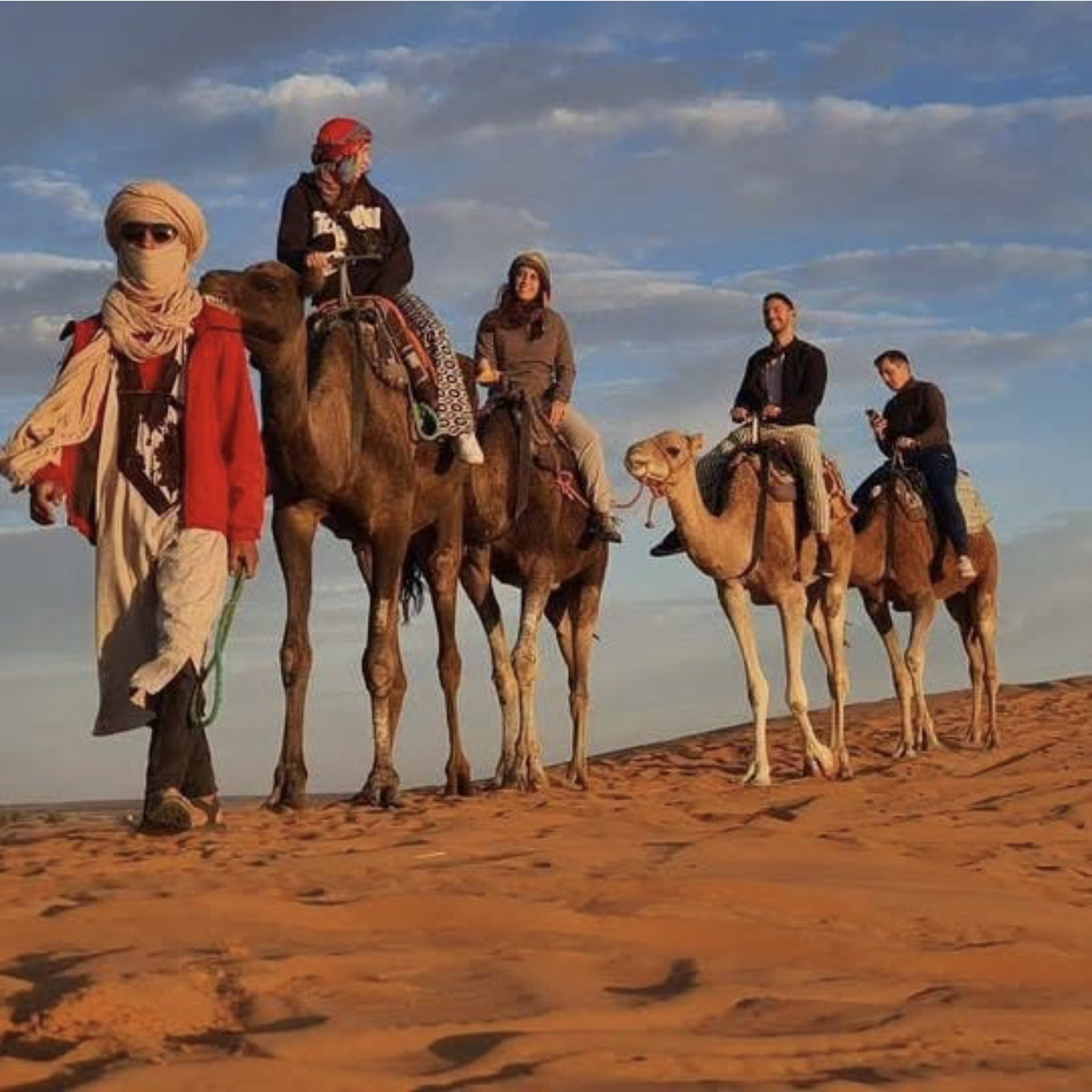 El paseo en dromedario durante el día por el desierto de Merzouga es una forma dinámica y agradable de recorrer las dunas y descubrir el paisaje del Sahara con luz plena. Durante la ruta podrás explorar diferentes zonas de Erg Chebbi, disfrutar de las vistas y vivir un momento único en contacto con el desierto. Es una experiencia con un toque de aventura, ideal para quienes quieren conocer Merzouga de una manera activa y disfrutar del entorno natural del Sahara.